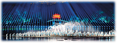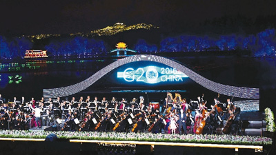 当演出终章《欢乐颂》的音乐响起时,一组“人工”喷泉摇曳绽放在如梦似幻的湖面上,三座灯光璀璨的钢结构“山峰”从水面缓缓升起,“G20”标志高高悬挂其上,在绚丽光束的映照下光芒四射。随着乐曲逐渐达到高潮,缤纷绚烂的焰火骤然点亮了整个夜空。