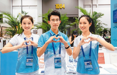 9月2日,志愿者在新闻中心合影。 新华社记者 张 铖摄