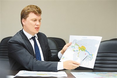 哈萨克斯坦铁路局执行总裁阿纳什金·谢尔盖耶维奇在向记者们介绍从成都出发的中欧班列途经哈萨克斯坦时的相关情况