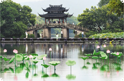 G20杭州峰会期间,《最忆是杭州》文艺晚会在西湖岳湖举行。峰会结束后,晚会现场成为游客游览观光的热门景点。图为9月7日,游客在晚会举办地拍照留念。