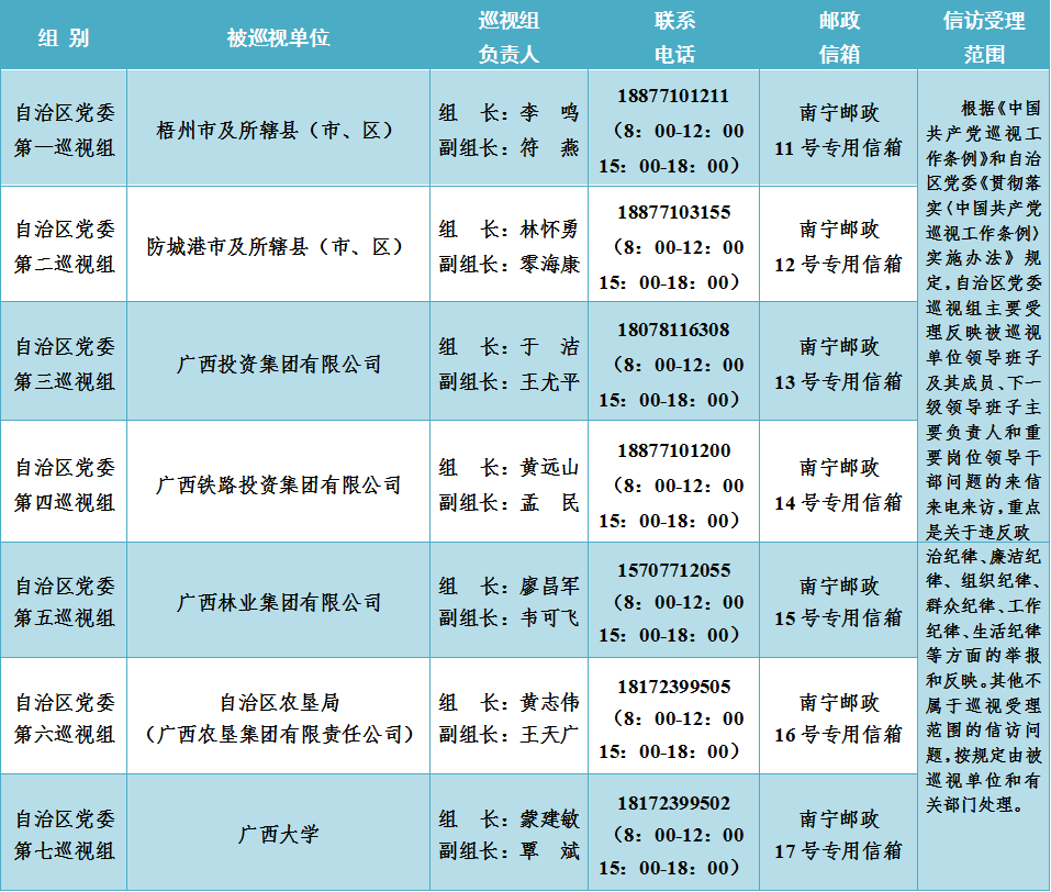 巡视“回头看”工作从9月中旬开始至10月底结束,自治区党委7个巡视组将采取“一对一”方式对2个设区市及其所辖县(市、区)、1个自治区直属部门、1所高校和3家自治区管理国有企业开展巡视“回头看”。