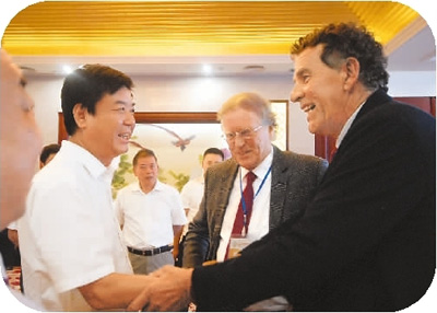 图为宝鸡市市长惠进才热情地向荷兰客商介绍宝鸡地域特点。