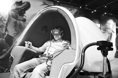 参观者在“福建VR体验中心”的设备上体验过山车游戏。