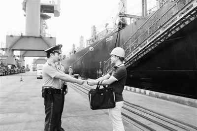 图为近日,新加坡籍“裕冠”轮刚靠泊漳州招银码头,漳州边检站官兵便第一时间为船上的漳龙三宝进出口有限公司负责人送来登轮证,并在10分钟内办结船舶出入境边检手续。