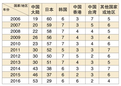在前100强品牌中,中国大陆的企业品牌占据53席,比去年的46席增加7席;日本的企业品牌占据29席,比去年的37席减少8席;韩国的企业品牌占据了6席,与去年持平;中国香港的企业品牌占据6席,比去年的2席增加4席;中国台湾的企业品牌占据2席,与去年减少1席。除这些国家和地区之外的国家和地区在前100强的品牌数量与去年基本持平。从品牌国别数量的变化上可以看出,中国大陆品牌数量有较明显增加,日本排在前100强的品牌数量有所下降。