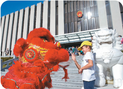 在中国驻欧盟使团大楼前,一名小男孩与中国舞狮互动。