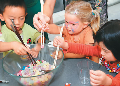 在中国驻欧盟使团大楼里,小朋友学习用筷子夹糖果。