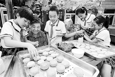 中秋佳节来临之际,河北省邢台市马路街小学的学生们来到平安老年公寓,与这里的老人们一起制作并品尝手工月饼,共享节日的快乐和甜蜜。图为孩子们与老人正在亲手制作月饼。