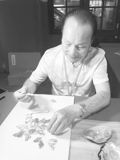 “甲子贝雕”技艺传承人刘永溪在活动现场展示。