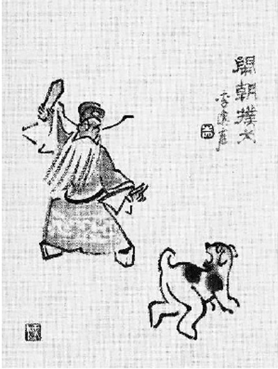 裴豹放出獒犬,獒犬见赵盾身穿白袍,扑向赵盾。力士提弥明出手一锤将獒犬打死。屠岸贾拔剑拿下提弥明,命武士推出斩首。屠岸贾奏本“犬扑赵盾,定是奸臣”,晋灵公下诏命屠岸贾将赵氏满门三百余人斩尽杀绝,赵盾之子驸马赵朔也被赐死。