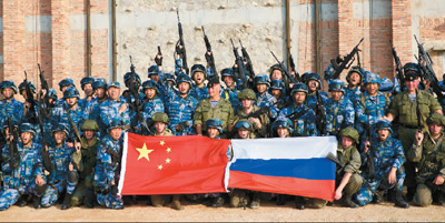 图为中俄海军陆战队员在共同完成直升机垂直速降演练之后合影。