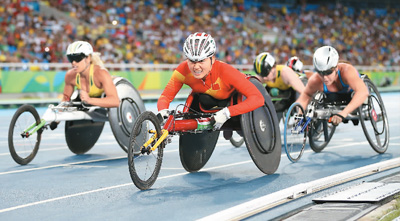 9月17日,在里约残奥会轮椅竞速女子800米T53级决赛中,周洪转获得冠军并打破世界纪录,为中国体育代表团摘得在里约残奥会上的第100枚金牌。当日,中国残奥军团共夺得11金,金牌总数达到105块。图为周洪转(前右)冲过终点。