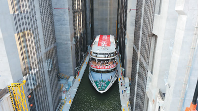 9月18日,目前世界上技术难度最高、规模最大的升船机——三峡升船机正式进入试通航阶段。这也是世界最大水利枢纽三峡工程的最后一个建设项目。图为承船厢载着游轮下降到升船机底部。