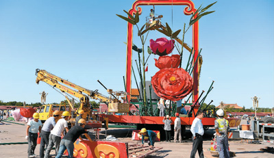 天安门广场国庆主花坛开始吊装