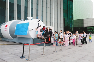 在“航天放飞中国梦”展区,记者看到,观众排起了长队。原来,于中秋之夜放飞太空的“天宫二号”“替身”现身中国科技馆,观众可以和“天宫二号”1∶1模拟舱近距离接触,看到真正的舱内航天服,在神舟飞船模型内亲身体验一把飞船发射,在“广寒宫”漫步,与“嫦娥”“玉兔”同框出镜的乐趣……