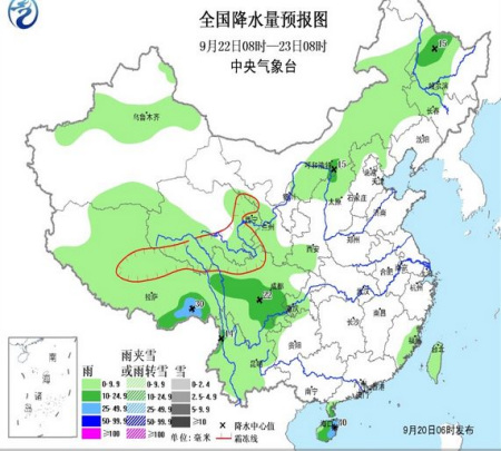 图1 全国降水量预报图(9月20日08时-21日08时)