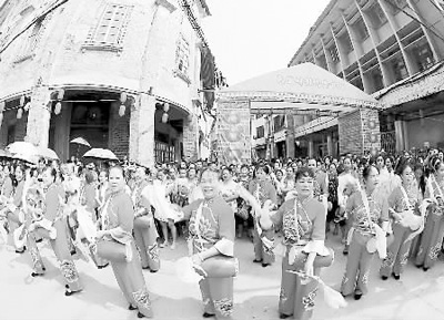 9月20日,广西融安县各族群众欢聚长安古镇骑楼街,用富有民族特色的腰鼓庆祝农业丰收。