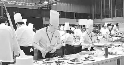 图为比赛现场厨师们抓紧时间准备菜肴。