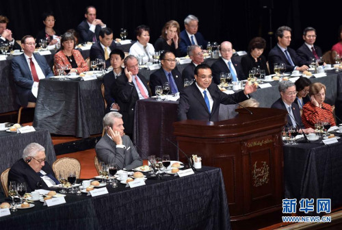 当地时间9月20日晚,李克强总理在纽约华尔道夫饭店出席纽约经济俱乐部及美中关系全国委员会、美中贸易全国委员会联合举行的欢迎晚宴,并同出席活动的美方友好人士互动交流。