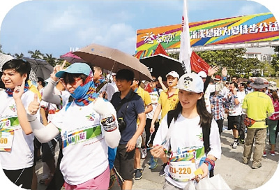 市民参与2016广州海珠国家湿地公园公益徒步活动。