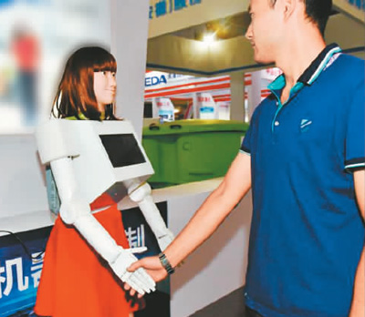 带机器人参展的企业相关负责人刘照强说,这款机器人最大特点是手臂和手部完全模仿人类的关节设计制作,因此真人能做的姿势机器人都可以做。据介绍,这款机器人主要是商用,可以在学校、科技馆、酒店、银行、餐饮、商场等工作,用于迎宾等。