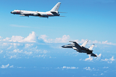 9月25日,中国空军出动40多架各型战机,前出西太平洋远海训练,多型战机成体系飞越宫古海峡,检验远海实战能力,同时出动轰炸机、歼击机在东海防空识别区进行例行性警巡。图为轰-6K、苏-30战机参加训练。