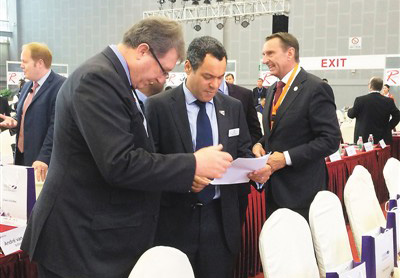 图为参加第二十二届世界航线发展大会的外国代表在相互交流。