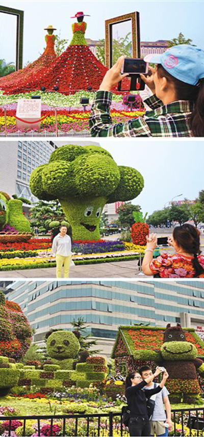 拼版照片为游人在长安街西单路口观赏国庆主题花坛。