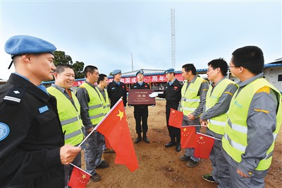 中国第四支驻利比里亚维和警察防暴队与驻利比里亚中资企业员工和华侨华人代表一同举行“战地国旗别样红”庆祝国庆活动。