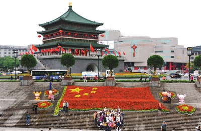 在陕西省西安市钟鼓楼、宝鸡市法门寺景区等地,人们布置花坛、鲜花、悬挂国旗,迎接国庆节。