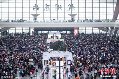 2016年10月6日,浙江省杭州市,外出旅游、探亲的旅客“扎堆”返程,铁路杭州东站迎来返程高峰,候车大厅内人山人海。 许康平 摄 图片来源:视觉中国