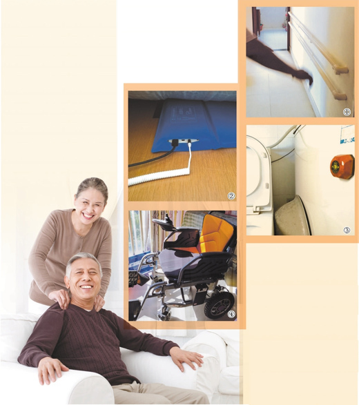 图①:连接着客厅、卧室、卫生间的走廊的扶手。图②:感应床垫,能监测呼吸、心率。图③:卫生间的呼叫器。图④:电动轮椅,方便老人自己行动。(记者刘念 摄)