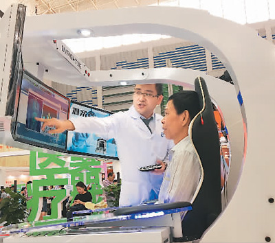 智慧医疗技术是海归创造的一个重点领域。在机器前坐上几分钟,就能诊病,这一想法正在逐渐变为现实。图为龙豪医疗总经理徐飞龙(右二)向体验者介绍他的身体检查结果。