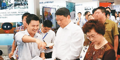 宁波市政府对人才引进非常重视。每年人才周期间,政府领导都会到展会现场“验收”成果,加油鼓励。图为今年展会上,宁波市委书记唐一军(中)正在认真倾听有关管廊检测机器人的介绍。这项能够在地下和密闭通道里使用的管廊机器人技术,来自在宁波的海归吕广强(左一)团队。