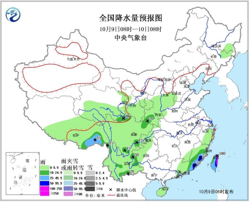 中新网10月9日电 据中央气象台消息,9日至10日,受台风“艾利”外围环流及南下冷空气共同影响,福建东南部、广东东部和南部、台湾等地有中雨或大雨,其中,福建东南沿海、广东东部、台湾东部等地的部分地区有暴雨、局地大暴雨(100~180毫米),上述局部并伴有短时强降水。