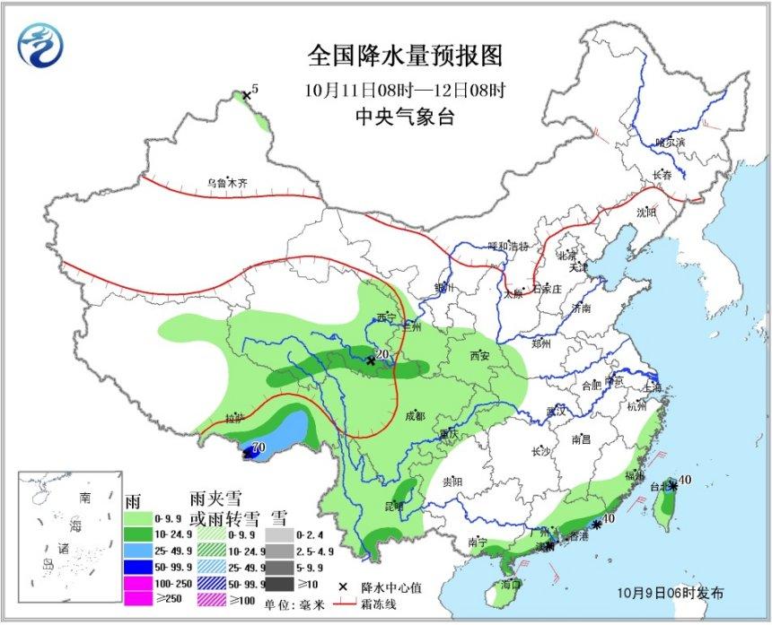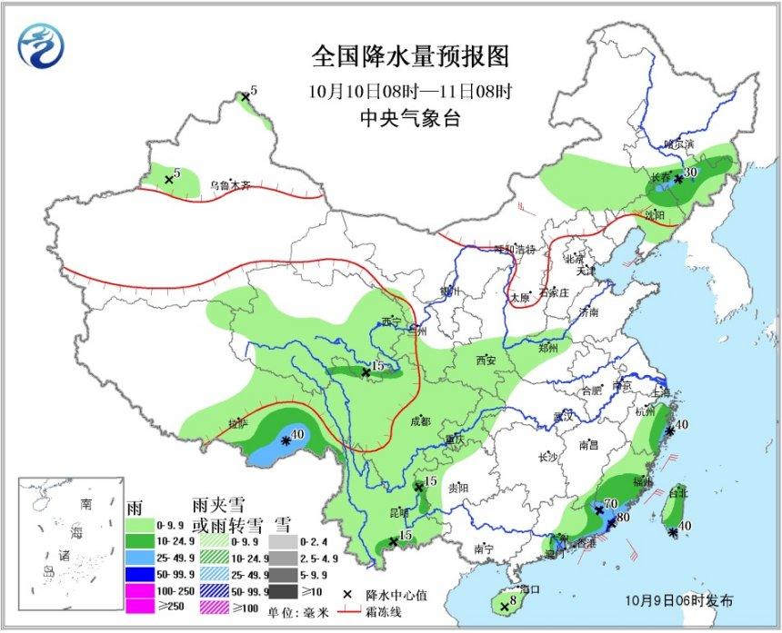 10日08时至11日08时,浙江东部、福建中南部、广东东部、台湾中东部等地有中到大雨,其中,广东东部的部分地区有暴雨(50~80毫米);另外,新疆沿天山西部、青海东部和南部、西藏东部、西南地区、内蒙古东部、东北地区中南部等地有小到中雨,局地有大雨。内蒙古中部、辽东半岛、山东半岛等地的部分地区有4~6级风,华南东部沿海地区有5~7级风。东海南部偏西海域、台湾海峡、南海北部有7~8级、阵风9~10级的大风,其中“艾利”中心经过的南海北部部分海域风力可达9级、阵风10~11级。