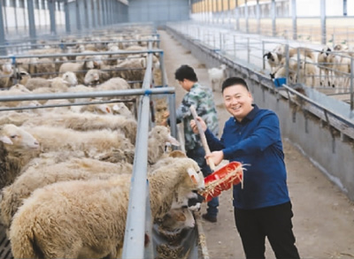 9月28日,河南省光山县孙铁铺镇陈大湾村返乡农民工吴继银在养殖合作社内给湖羊喂草料。