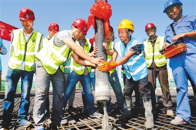9月20日,北京城建集团农民工正在浇筑北京新机场主航站楼地下结构工程最后一块顶板。