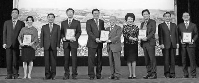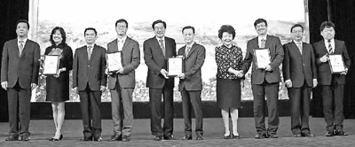中共中央政治局委员、北京市委书记郭金龙(左五),国务院侨办主任裘援平(右四),北京市市长王安顺(左三),北京市人大常委会主任杜德印(右二),北京市政协主席吉林(左一)为第二届“京华奖”获奖者孟宙(左二)、王中林(左四)、许荣茂(右五)、蔡蔚(右三)、吴晨(右一)颁奖。