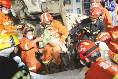 图为当日18时45分左右,救援人员在倒塌现场救出一名小女孩,获救时还有生命体征。目前小女孩已被送往医院治疗。