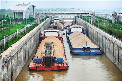 湖南加速水运建设融入长江经济带。图为满载运行中的湘江长沙综合枢纽船闸。