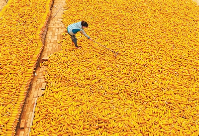 图为河北省泊头市文庙镇高庄子村农民在自家门前晾晒玉米。