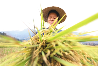 图为广西三江侗族自治县良口乡和里村村民在田间收割再生稻。