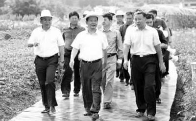 广西壮族自治区党委书记彭清华(中)在贺州市委书记赵德明(左一)的陪同下考察黄姚花海,深入调查乡村旅游扶贫情况。