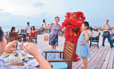 图为马尔代夫班多斯岛上,中国游客与舞狮合影留念。