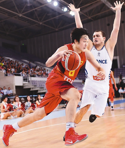 七月六日,中国队球员丁彦雨航(左)在比赛中带球突破法国队防守。