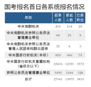 通过首日各系统报名情况,可发现中央党群机关和中央国家行政机关(本级)报名热度较高,是考生竞争比较激烈的系统,压力相对较大。