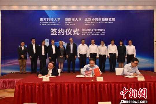 10月15日南方科技大学与北京协同创新研究院、密歇根大学,15日在此间签订合作协议,三方将联合研究、共建先进制造国际协同实验室。