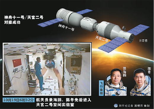 在神舟十一号与天宫二号成功实现自动交会对接后,19日6时32分,航天员景海鹏、陈冬先后进入天宫二号空间实验室。