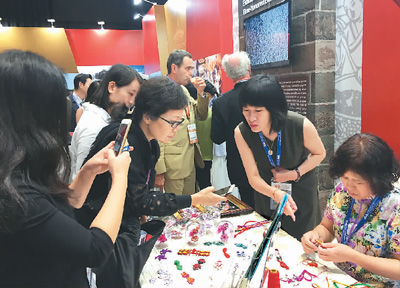在展览专设的北京老字号展区,代表北京117家 “中华老字号”参展的内联升的布鞋、吴裕泰的茶叶、瑞蚨祥的丝绸、戴月轩的湖笔、盛锡福的帽子、红螺的果脯、红都的中山装、珐琅厂的景泰蓝等8家久负盛名的老字号现场进行绝活展演。这8家老字号中有6家拥有百年以上历史,全部拥有国家或北京市级非物质文化遗产称号。